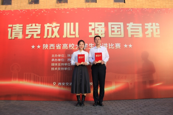 12月2日下午,由中共陜西省委教育工委主辦、西安交通大學承辦的陜西省高?!罢堻h放心·強國有我”大學生宣講比賽現場總決賽在西安交通大學興慶校區舉行。經過激烈角逐,我校人文學院本科生董芳棋獲得特等獎,信息學院研究生葉潤澤獲得一等獎。