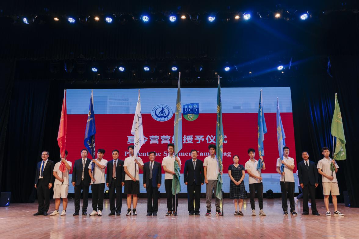 外籍教師代表Dominick Principe和學生代表毛衛昱分別就參加本次夏令營的感受進行發言。隨后與會領導為夏令營參訓學生代表授予營旗。