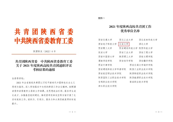 近日,共青團陜西省委、中共陜西省委教育工委印發了《關于2021年度陜西高校共青團述職評議考核結果的通報》,共青團陜西省委印發了《關于表彰2020-2021年度“陜西省優秀共青團員”“陜西省優秀共青團干部”及“陜西省五四紅旗團支部”“陜西省五四紅旗團委”的決定》,校團委榮獲“2021年陜西高校共青團工作優秀單位”稱號,校黨委副書記黎開誼榮獲“2021年陜西高校支持共青團工作好書記”稱號,校團委副書記李陽榮獲“2020-2021年度陜西省優秀共青團干部”,校團委學生創新創業實踐中心副主任石涌泉榮獲“2021年陜西高校共青團工作先進個人”稱號,校學生會執行主席張瑞熙榮獲“2020-2021年度陜西省優秀共青團員”。