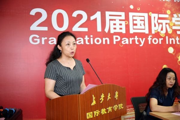 教師代表席岳婷副教授講話,她代表教師向2021屆順利畢業的國際學生表示衷心的祝賀!她期望畢業生們永遠保持善良和真誠,保持對世界的探索,做到交流互鑒,成就彼此。