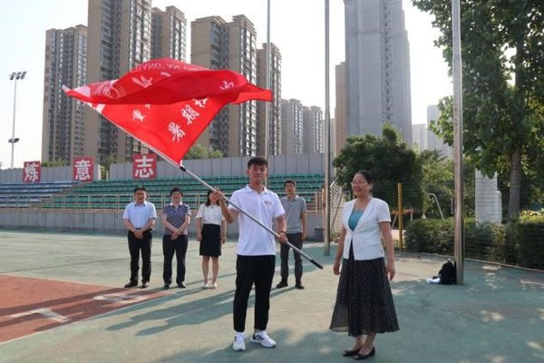 彪曉紅為馬克思主義學院“重溫長征精神 走好新時代長征路”主題實踐活動出征隊伍授旗。
