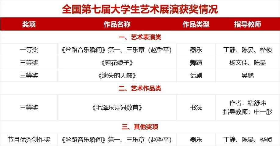 6月12日至17日,全國第七屆大學(xué)生藝術(shù)展演活動在湖北省襄陽市舉辦。本屆展演中,長安大學(xué)斬獲全國獎項5項,創(chuàng)我校參加全國大學(xué)生藝術(shù)展演以來的歷史最好成績。其中,器樂作品《絲路音樂瞬間》第一、三樂章(趙季平)首次斬獲藝術(shù)表演類全國一等獎和優(yōu)秀創(chuàng)作獎,并赴襄陽首次參加全國現(xiàn)場展演。舞蹈作品《剪花娘子》、戲劇作品《遺失的天籟》獲藝術(shù)表演類三等獎,書法作品《毛澤東詩詞數(shù)首》獲藝術(shù)作品類三等獎。