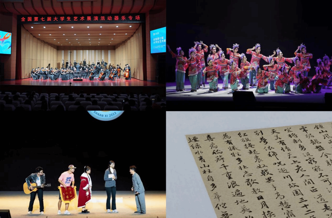 《絲路音樂瞬間》融合了東西方音樂的精髓,以絲綢之路為靈感,通過趙季平先生的妙筆,將千年的絲路文化歷史與音樂完美融合。舞蹈《剪花娘子》取材于國家非物質(zhì)文化遺產(chǎn)旬邑彩貼剪紙,表現(xiàn)了藝術(shù)家的不懈追求和傳統(tǒng)剪紙藝術(shù)的魅力,展現(xiàn)了長大師生為傳承和發(fā)揚傳統(tǒng)文化所做的努力。話劇《遺失的天籟》講述了大學(xué)生藝術(shù)團走進鄉(xiāng)村小學(xué),用音樂啟迪孩子們心靈的故事,展現(xiàn)了藝術(shù)對育人的重要作用。行書條幅書法作品《毛澤東詩詞數(shù)首》用書法形式展現(xiàn)了詩詞中蘊含的豐富的藝術(shù)價值和深厚的思想內(nèi)涵,既弘揚了中華傳統(tǒng)文化和革命文化,也展現(xiàn)了深厚的家國情懷。