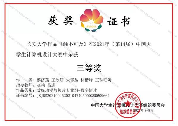 由教育部高等學校計算機類專業(yè)教學指導委員會、教育部高等學校軟件工程專業(yè)教學指導委員會等主辦的第14屆中國大學生計算機設(shè)計大賽評審結(jié)果揭曉。我校選送的參賽作品獲國家三等獎1項、西北賽區(qū)一等獎1項、三等獎2項的優(yōu)異成績。由廣播影視系教師趙艷指導的《觸不可及》獲得數(shù)媒動漫與短片專業(yè)組西北賽區(qū)一等獎、全國總決賽三等獎。由廣播影視系教師侯婧、許琦指導的《中國紅拳》、《腰鼓少年》獲得數(shù)媒動漫與短片專業(yè)組西北賽區(qū)三等獎。
