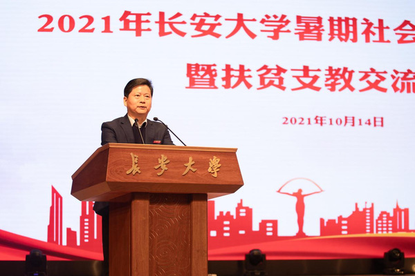 校團委書記張永宣讀了《關于表彰2021年長安大學暑期“三下鄉”社會實踐活動先進集體、先進個人和優秀成果的決定》。校團委副書記丁芝娟以《把黨史學習教育轉化為青春向黨的生動實踐》為題,對我校2021年暑期社會實踐的工作舉措、工作成效、工作特色進行了匯報。