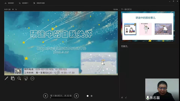 晚上7點,心理健康教育與咨詢中心副主任張石磊在“虹”學講堂(353講)以“研途中的自我關愛”為題開展講座,600余名研究生在線參加。張石磊以調查問卷的形式,了解研途中學子們遇到的現實心理困難,以此引出“自我關懷”的主題,通過闡述自我關懷的內涵、積極效應和誤區,指導學生進行自我關懷。張石磊給“研途”中學生寄語:溫暖、友愛、同情的對待自己,真正的治愈才有可能發生。在互動環節回答學生提問,線上氣氛熱烈。