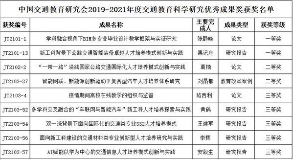 中國交通教育研究會每兩年舉辦一次教育科學研究優秀成果評獎活動,旨在充分調動各高校開展交通教育科學研究的積極性、主動性和創造性,激勵廣大交通教育工作者提高交通教育科學研究的質量、特色和水平,服務交通人才培養和交通強國建設,本次共評審優秀成果獎179項,其中一等獎27項、二等獎45項、三等獎107項。