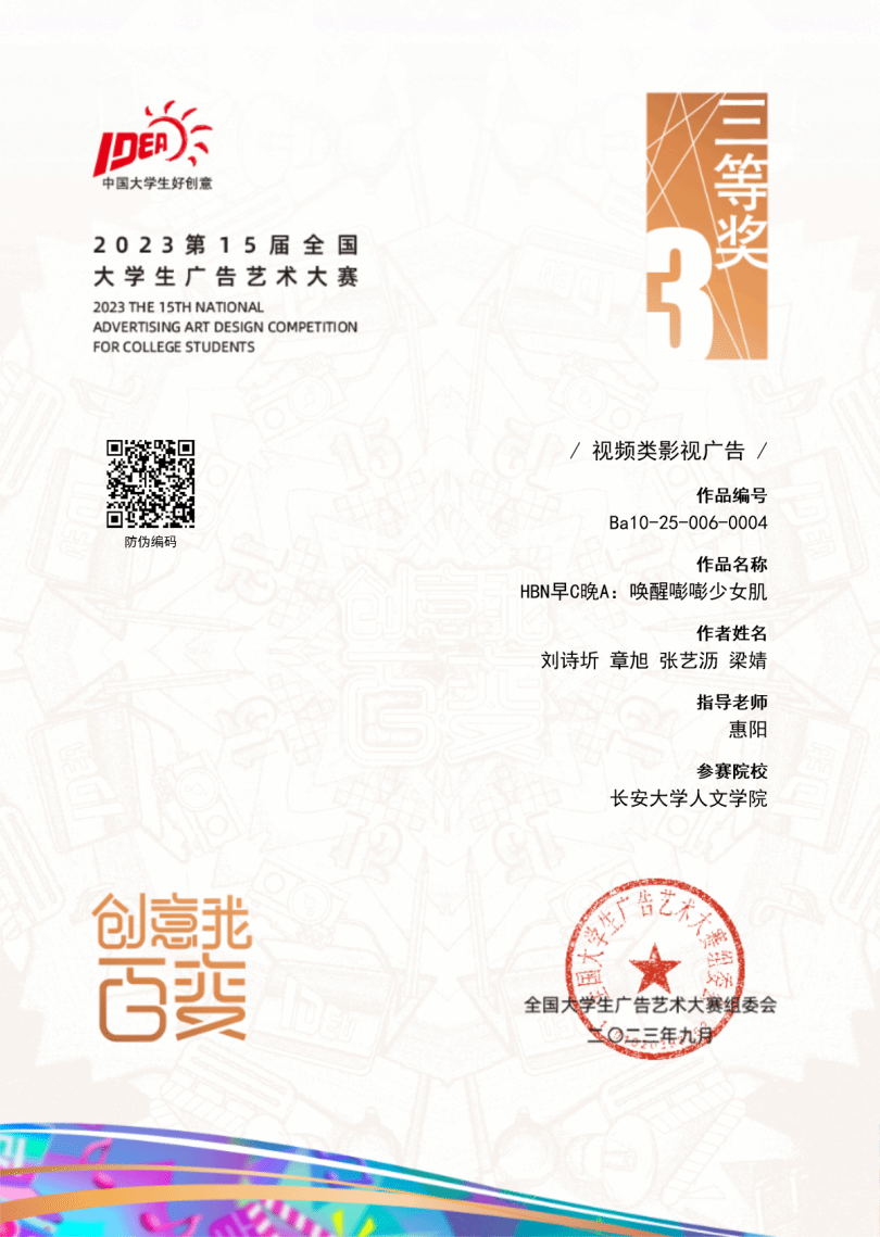 其中,由廣播影視系教師侯婧指導(dǎo),學(xué)生呂雯菁、張藝嘉、劉秉霖創(chuàng)作作品《聯(lián)通沃派,跑的超快》獲二等獎(jiǎng);由人文學(xué)院實(shí)驗(yàn)中心教師惠陽(yáng)指導(dǎo),學(xué)生劉詩(shī)圻、章旭、張藝瀝、梁婧創(chuàng)作作品《HBN早C晚A:?jiǎn)拘燕剜厣倥 帆@三等獎(jiǎng)。