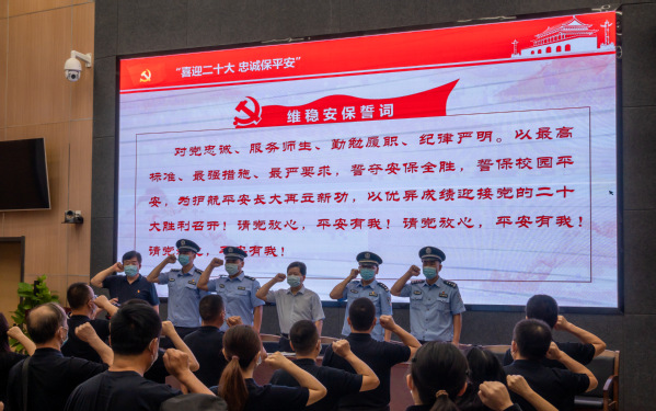 保衛干部及校衛隊員代表上臺發言,承諾全體保衛干部職工將以更嚴的舉措確保絕對安全、以更高的標準呈現絕對精彩、以更大的合力彰顯絕對熱情,踔厲奮發創佳績,勠力同心迎盛會,守好門、站好崗,全心全意服務好廣大師生員工。最后,保衛干部職工進行維穩安保集體宣誓。