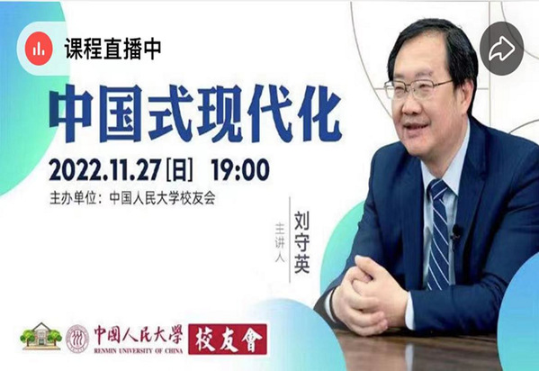 中國人民大學劉守英教授以《中國式現代化》為題,圍繞現代化、中華民族謀求現代化進程與內涵擴展、中國式現代化的共同特征和獨特性三個方面,從歷史邏輯、理論邏輯和實踐邏輯三個角度對黨的二十大報告中提出的中國式現代化進行了詮釋和解讀。劉守英教授表示,現代化是人類歷史上最劇烈、最深遠、最徹底的社會變革,中國共產黨是中國式現代化的領導力量,中國共產黨通過制度變革推動中國現代化,開創了社會主義現代化的新境界。牢牢把握新時代新征程黨的使命任務,必須深入理解和把握中國式現代化的本質要求,不斷鞏固全國各族人民大團結,加強海內外中華兒女大團結,形成同心共圓中國夢的強大合力,以中國式現代化全面推進中華民族偉大復興。