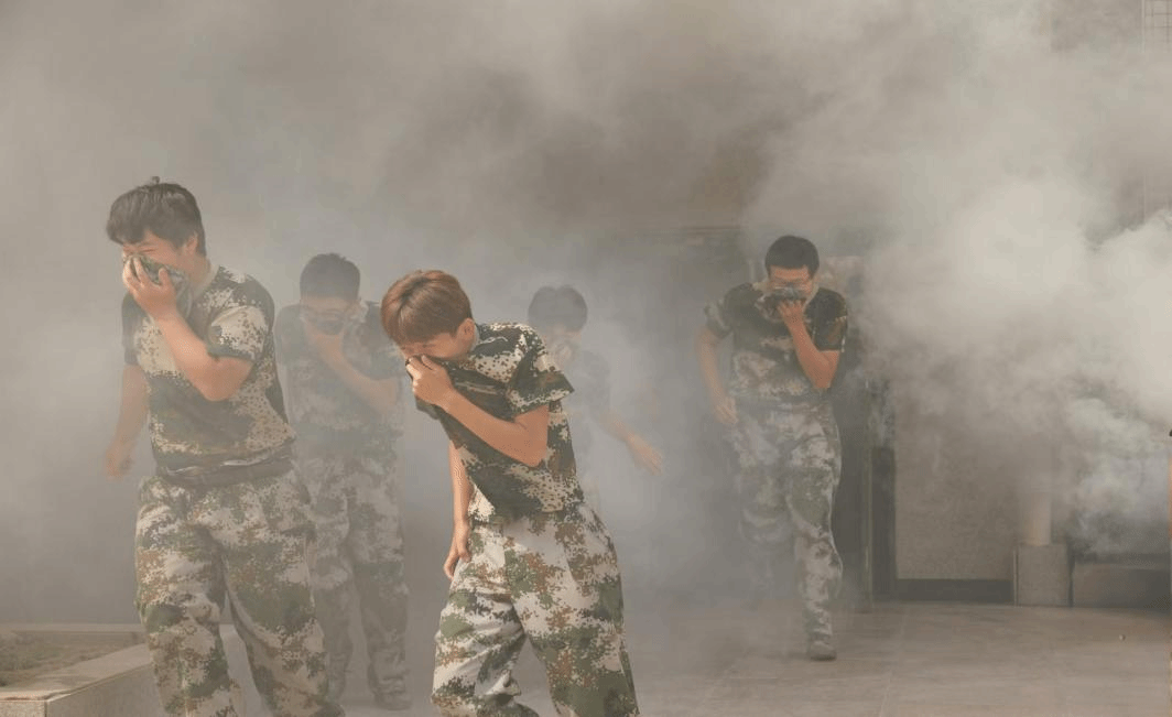 本次演練的主要內容為模擬宿舍發生火情后學生疏散逃生。伴隨著現場煙霧升起,“火情”警報拉響,建筑物內應急燈開啟,管理員立即打開學生公寓應急門,現場救護車和醫護人員嚴陣以待。學生們用迷彩帽代替毛巾輕捂口鼻,低頭貓腰,沿著疏散路線由出口撤離,并在指定地點集合。從“火情”發生到學生疏散完畢,整個過程秩序井然、快速高效。