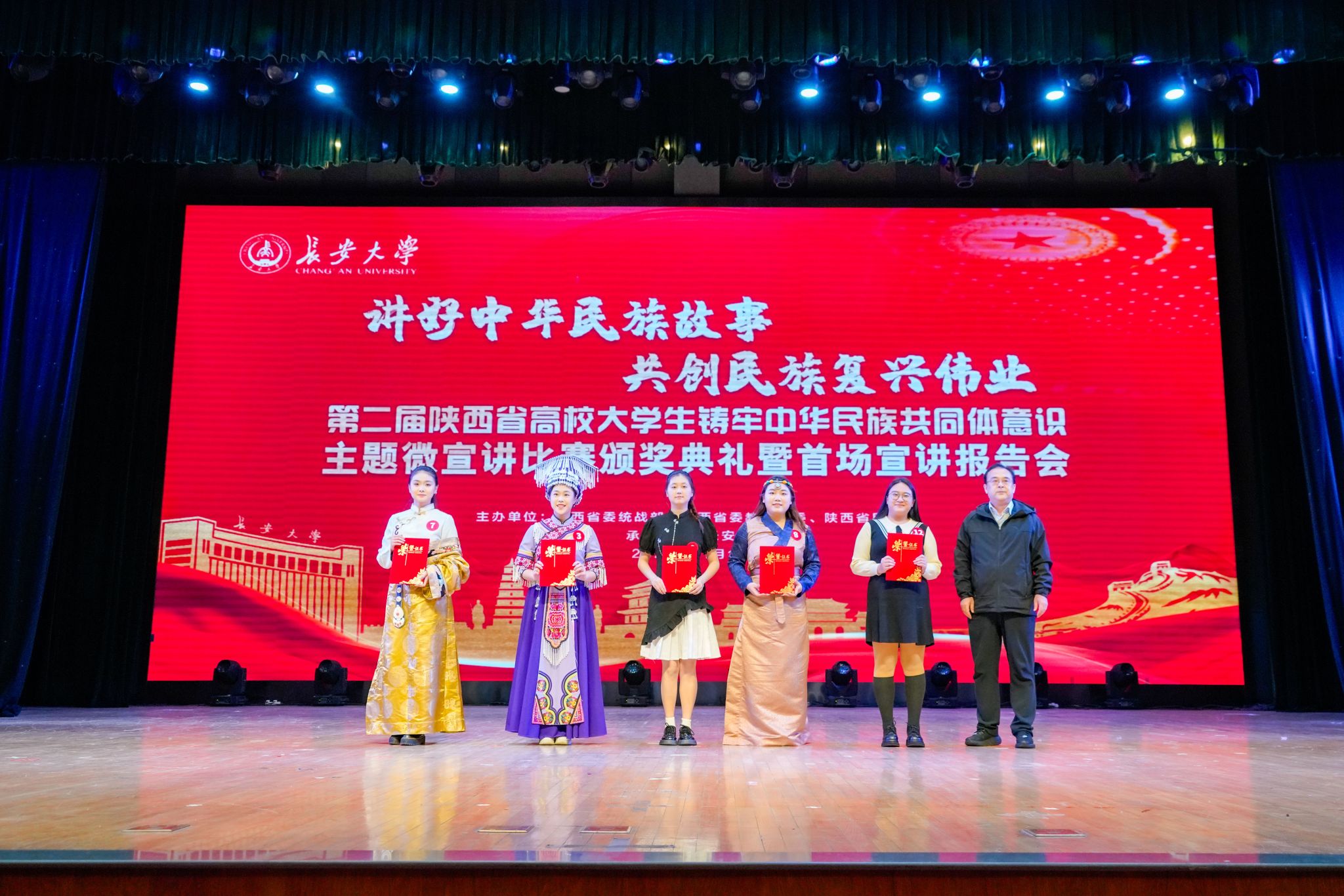 11月16日下午,“講好中華民族故事,共創民族復興偉業”第二屆陜西省高校大學生鑄牢中華民族共同體意識主題微宣講比賽頒獎典禮暨首場宣講報告會在北校區長安文化藝術中心舉行。省民宗委副主任王曉斐、校黨委副書記黎開誼、省民宗委民族一處處長張巖松、省委統戰部民族宗教處副處長張鑫、省委教育工委統戰部副部長白瑩、省民宗委民族一處一級調研員孟旭紅出席大會。