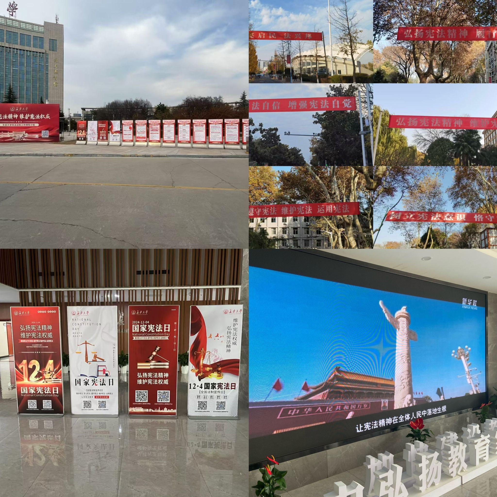 氛圍營造——宣傳覆蓋全面。學校新媒體矩陣發布普法宣傳內容,引導學生尊崇憲法、學習憲法、維護憲法、運用憲法;通過電子屏幕播放憲法宣傳視頻,在校園懸掛橫幅標語,在圖書館廣場、北辰樓設立宣傳桁架和展板,廣播播放《憲法伴我們成長》歌曲,向師生發放“憲法宣傳冊”等方式在全校范圍內營造全方位、多層次、深維度的學習氛圍。