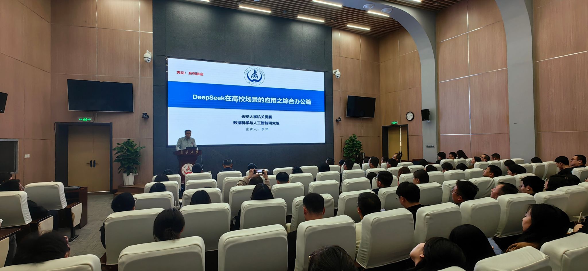 數據科學與人工智能研究院副院長李偉教授以“DeepSeek在高校場景的應用之綜合辦公篇”為主題,從DeepSeek是什么、為什么要學DeepSeek、如何快速使用DeepSeek等方面,深入講解DeepSeek融入教育教學、科研、行政辦公及多工具協作場景的應用。信息與網絡管理處信息部主任趙佳釤圍繞“從跟隨到引領,以AI驅動教育管理創新”主題,從“AI算力中臺、AI賦能辦公應用、AI賦能教育數字化轉型”等方面進行講解,重點介紹了長大AI算力中臺、智能體開發平臺建設情況,并對DeepSeek在公文撰寫、數據治理等多場景下的強大功能進行了演示。