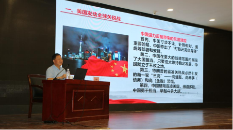 許森教授從歷史背景、發展局勢、矛盾動因等多個維度,對中美經貿博弈與區域安全形勢進行了全面深入剖析。他指出,在經濟領域,美國發動關稅戰,意圖重塑全球貿易體系,但中國憑借完整產業鏈和開放戰略已具備反制能力;在科技領域,美國加緊封鎖,而中國青年科研力量崛起,大國重器頻出,正在突破技術壁壘;面對美國在臺海、南海等地的軍事圍堵,中國以綜合國力為支撐,展現出堅定戰略定力。講座深化了參會師生對中美貿易戰及當前國際局勢的認識理解,有效激發了全體師生的愛國情懷與擔當意識。
