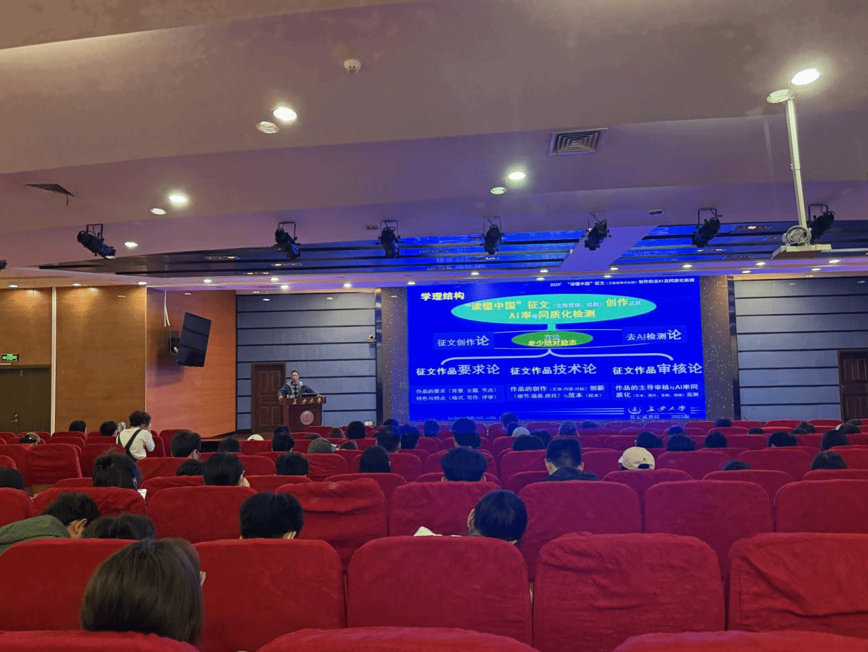 為進一步提升我校關工委的工作能力和水平,構建關工工作融入校園大思政育人格局,4月13日上午,校關工委在北校區北辰樓會議中心二層報告廳舉辦2025年“讀懂中國”活動培訓暨推進會,邀請校關工委副主任賀宏斌教授以《“讀懂中國”征文創作及其AI率等同質化檢測--“讀懂中國”征文(含微視頻、短劇)作品的內容創新與AI等挑戰應對》為題做輔導報告。各學院學生和各二級關工委相關負責人共計百余人參加會議。校關工委常務副主任、離退休工作處黨總支書記戴宏出席會議并做動員講話,會議由校關工委辦公室主任、離退休工作處黨總支副書記徐苑芝主持。
