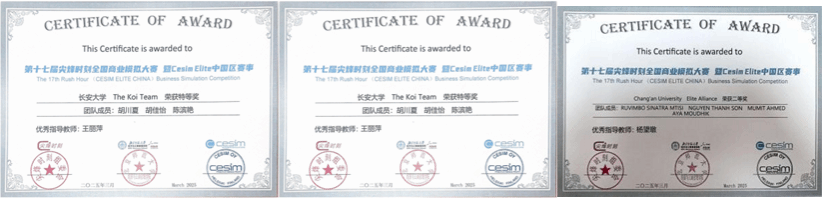3月28日至30日,第十七屆尖烽時刻全國商業模擬大賽總決賽在北京師范大學舉行。長安大學經濟與管理學院本科生代表隊“The Koi Team”榮獲全國唯一特等獎、MBA代表隊“常來長安”隊榮獲全國一等獎,留學生代表隊“Chang'an University Elite Alliance”榮獲全國二等獎,學院工商管理系教師王麗萍榮獲“優秀指導教師獎”。