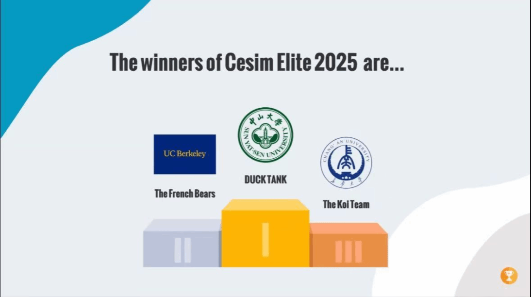 本屆比賽于2025年5月26日至6月2日舉行,采用線上形式進(jìn)行。長安?學(xué)The KOI Team本科生隊(duì)在模擬經(jīng)營環(huán)節(jié)和案例分析環(huán)節(jié)展現(xiàn)了精準(zhǔn)的市場判斷和投資策略,獲得評委的高度認(rèn)可,斬獲全球總決賽季軍。這一成績是我校在此項(xiàng)賽事的歷史最佳成績,我校The KOI Team本科生隊(duì)也成為賽事歷史上第5支入選 Cesim Elite全球商業(yè)模擬?賽名?堂的本科生隊(duì)伍。
