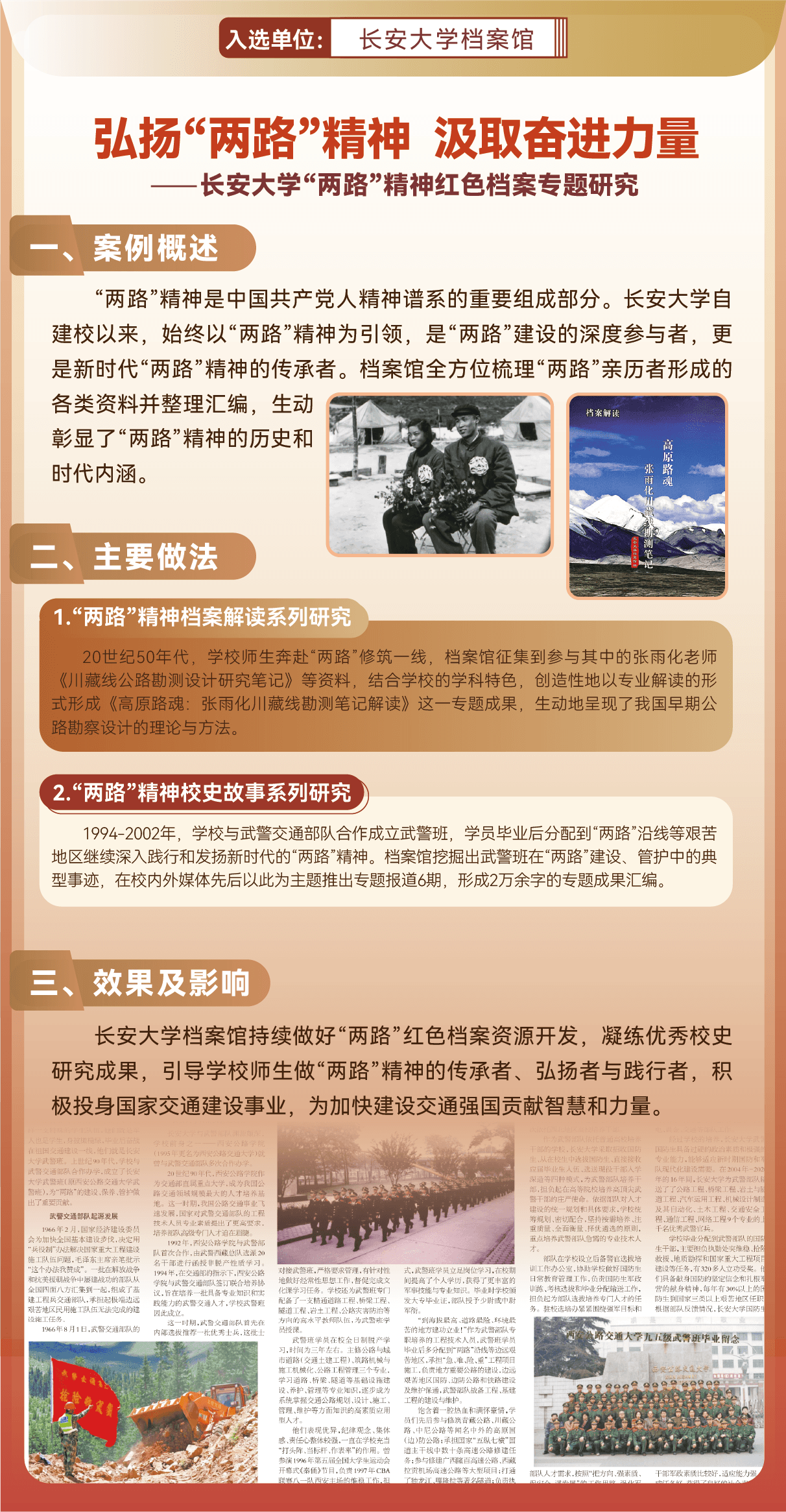 長(zhǎng)安大學(xué)是“兩路”建設(shè)的深度參與者,更是新時(shí)代“兩路”精神的傳承者。檔案館始終堅(jiān)定貫徹落實(shí)《檔案法》及其相關(guān)實(shí)施條例的要求,以“兩路”精神為引領(lǐng),聚焦立德樹人根本任務(wù),深挖紅色檔案資源,全方位地梳理、展示“兩路”親歷者在參與筑路、養(yǎng)護(hù)過程中的各類圖文資料收集并整理匯編,不斷發(fā)掘“兩路”精神的歷史內(nèi)涵和新的時(shí)代意義,引導(dǎo)學(xué)校師生做“兩路”精神的傳承者、弘揚(yáng)者與踐行者,積極投身國(guó)家交通建設(shè)事業(yè),為加快建設(shè)交通強(qiáng)國(guó)貢獻(xiàn)智慧和力量。