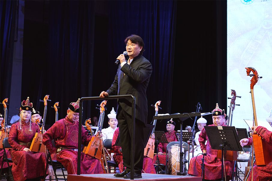 音樂會開始前,張軍介紹了馬頭琴樂團所在地鄂爾多斯市烏審旗的有關情況,并為畢業生和全校師生送上來自草原的祝福。演出以“交響樂與馬頭琴的獨特結合”為主題,由陜西省歌舞劇院國家一級指揮嚴松波執棒,通過三個篇章的演奏,實現了中華傳統音樂元素與現代交響樂的完美交融。音樂會上篇以馬頭琴管弦樂《馬背雄風》拉開序幕,弦樂生動地模擬出駿馬嘶鳴,經典音樂配合交響編曲,共同描繪出一幅壯闊的草原詩畫。中篇由三首樂曲組成,原生態組合《吉祥頌》中,蒙古族“呼麥”演唱者喉音震蕩,聲部疊加如大地回響。下篇是創新與經典的熱烈碰撞,電影《加勒比海盜》主題曲經馬頭琴重構,交響銅管與馬尾弦共奏出船只劈波斬浪的聲場,結尾曲《萬馬奔騰》,琴弓飛旋如馬蹄激揚,將現場氣氛推向高潮。