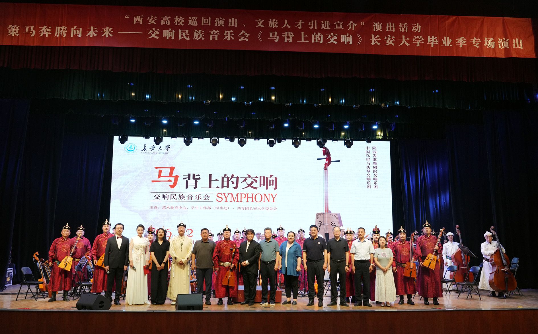 6月12日晚,“策馬奔騰向未來”——交響民族音樂會《馬背上的交響》長安大學畢業季專場演出在長安文化藝術中心大禮堂奏響,陜西省歌舞劇院交響樂團與中國烏審馬頭琴交響樂團聯袂獻藝,以國家級非物質文化遺產馬頭琴的蒼茫弦音與現代交響樂的激烈碰撞,為師生帶來一場跨越時空的藝術盛宴,也用“策馬奔騰”的美好寓意為全體2025屆畢業生送上祝福。長安大學副校長范文,鄂爾多斯市烏審旗文化和旅游局黨組書記、局長張軍參加活動。