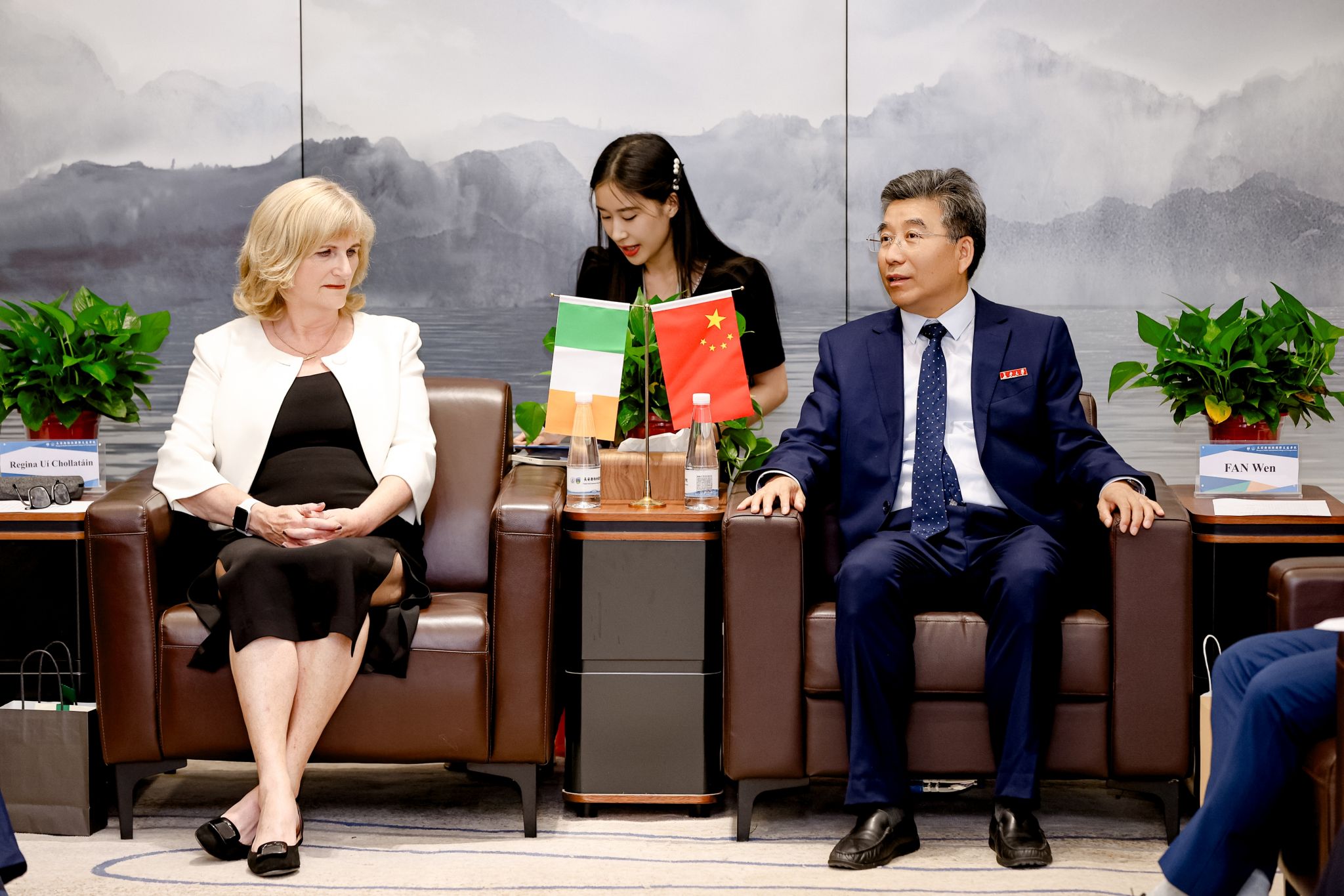 范文對Regina Uí Chollatáin一行的到來表示熱烈歡迎,并對都柏林大學長期以來積極推動與我校的合作表示感謝。他指出,兩校共同設立的長安都柏林國際交通學院在雙方共同努力下,人才培養質量不斷提升,辦學成效顯著,已逐步建立起互信、互利、共贏的合作基礎。他希望未來雙方持續深化交流與合作,將長安都柏林國際交通學院建設為中外合作辦學及高質量人才培養的典范。