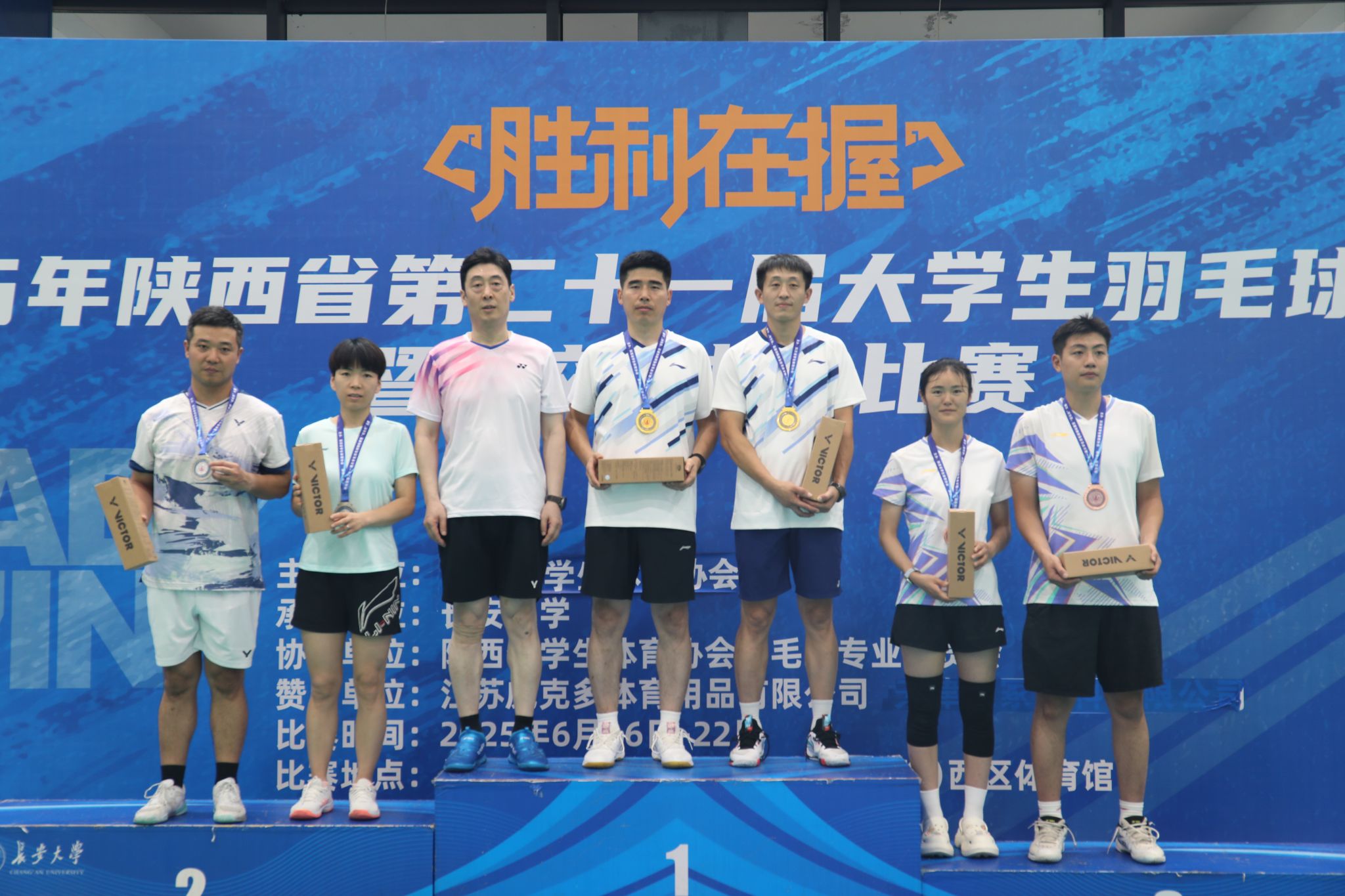 6月22日,由陜西省學生體育協會主辦,長安大學承辦,陜西省學生體育協會羽毛球專業委員會協辦的2025年陜西省第二十一屆大學生羽毛球錦標賽暨“校長杯”比賽在我校北校區圓滿落幕。中國學生體育聯合會副主席、陜西省學生體育協會主席劉寶平,我校黨委副書記李文雄,西安電子科技大學副校長朱文凱,西北大學黨委副書記張清,西北政法大學副校長孫昊亮,西安職業技術學院院長李剛,我校體育系黨總支書記唐少君,陜西省學生體育協會副主席、我校體育部(系)主任杭蘭平,陜西省學生體育協會副秘書長程磊、李建,陜西省學生體育協會羽毛球專業委員會(大學)主任齊朝勇等出席本次比賽并頒獎。