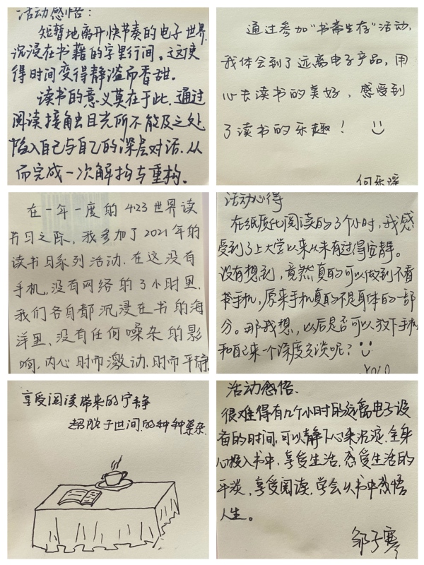 “世界讀書日”系列活動之書齋生存3小時。4月24日、25日,圖書館分校區(qū)為全校師生籌備了以“放下手機、靜心閱讀”為主旨的“世界讀書日”系列活動之書齋生存3小時,期盼全校師生走近圖書、親近閱讀,養(yǎng)成終身讀書、終身學習的好習慣。此次活動共有300余位師生參與,讀者們遠離電子設備,全身心享受閱讀,感受讀書的樂趣,同時也留下了自己的書齋生存感言。