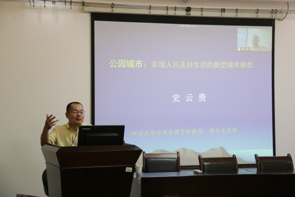 5月28日晚,人文學院特邀四川大學公共管理學院院長史云貴教授在學院412學術報告廳作題為“公園城市:實現人民美好生活的新型城市形態”的報告。報告會采取線下、線上相結合的形式,學院100余名師生線下參加了本次報告會,近200名研究生通過騰訊會議參加了此次報告會。報告會由公共管理學科負責人范麗莉副教授主持。