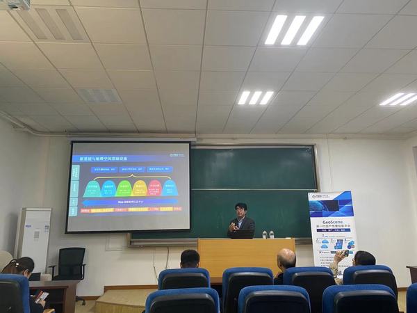 座談會后,蔡曉兵在學院學術報告廳做報告。他以“地理之道,見人所未見”引入本次報告的主題。介紹了地理之道、空間基礎設施、地理空間平臺、新基建等現代GIS的主要內容。接著展示了地理設計、實時物聯網、三維時空、大數據、GeoAI等行業前沿科學技術。
