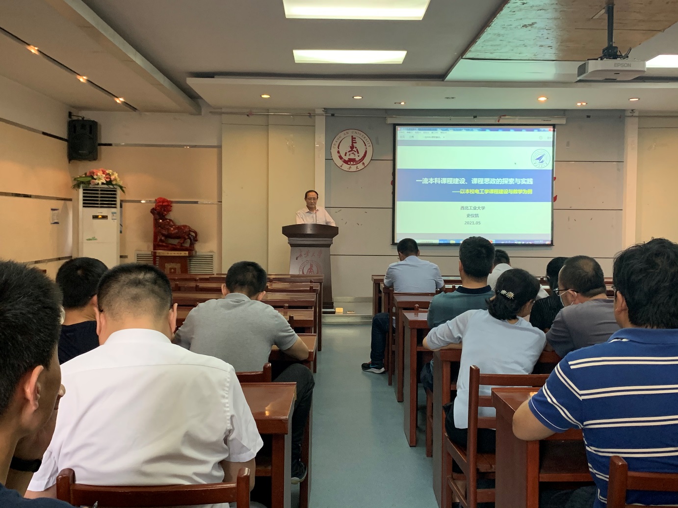 史儀凱教授圍繞著“什么是一流本科課程、課程建設與教學中存在的若干問題、課程建設與思政的探索實踐”等內容,深入淺出地向全體教職工介紹了一流本科課程(金課)的定義與理解,新時代如何做一名好老師、如何提升教育教學水平等問題進行了深刻闡述。他強調,立德樹人是高校立身之本,關鍵在培養出一流人才,才能建設和教好一流課程;最后史教授結合個人負責的課程教學,對課程建設情況與課程思政元素挖掘等內容進行了詳細介紹。短短一個半小時的報告讓參會教師受益匪淺。