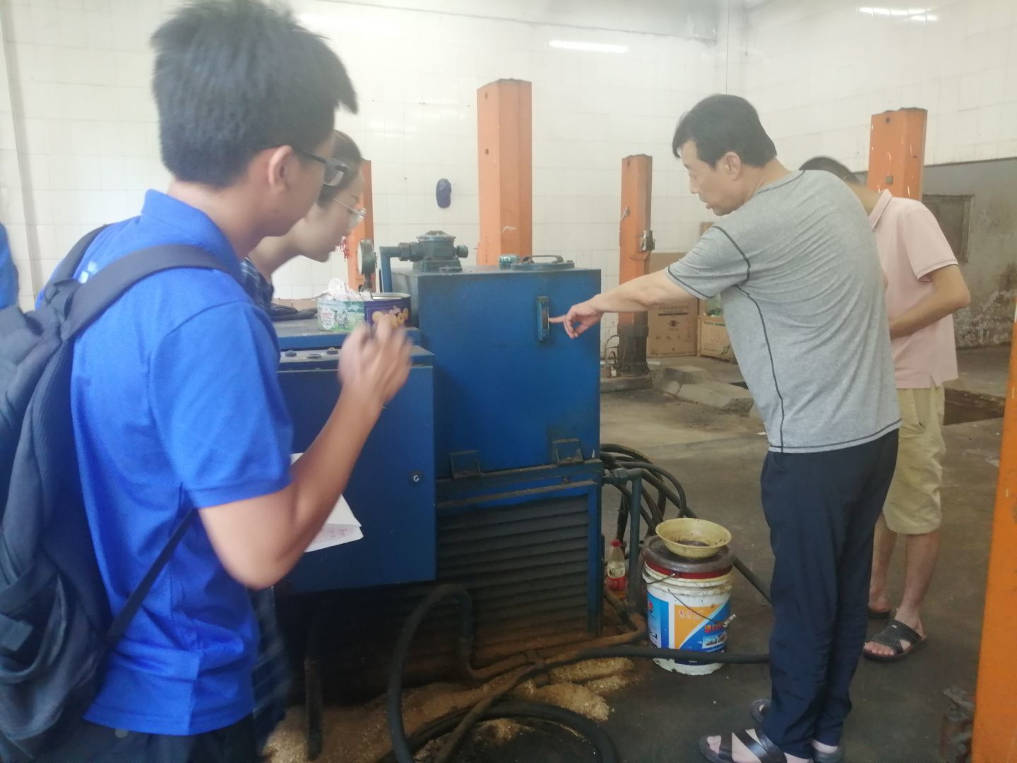 實(shí)踐隊(duì)在垃圾壓縮站內(nèi)聽(tīng)負(fù)責(zé)人講解設(shè)備運(yùn)行