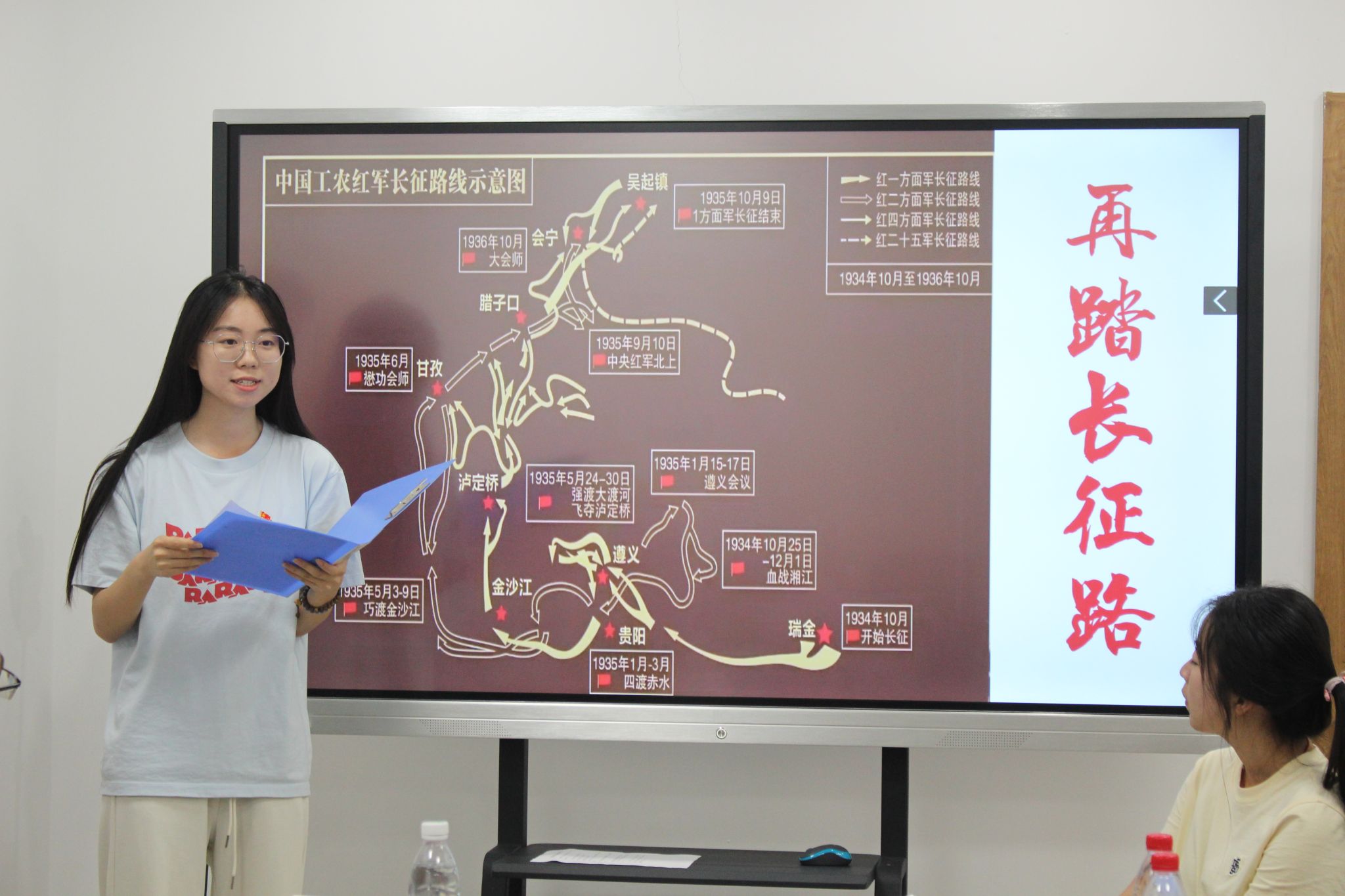 “紅色書屋閱讀”環節中,大家靜靜翻閱,傾心感悟。隨后,各位入黨積極分子起身發言,說出他們心中對于這些書的見解和心得。在“《紅巖》情景扮演”環節,組長黃喆愷攜手三名組員,呈現了一場簡短而精彩的表演。大家無不為之動容,再一次感悟了革命前輩舍生取義的精神。而后,本科生第四黨支部的黨員們走上前,在長征地圖上帶領大家重溫長征之路。一段“再踏長征路”沙盤演繹訴盡沿途艱險多難,再現紅軍英勇剛毅的光輝形象。