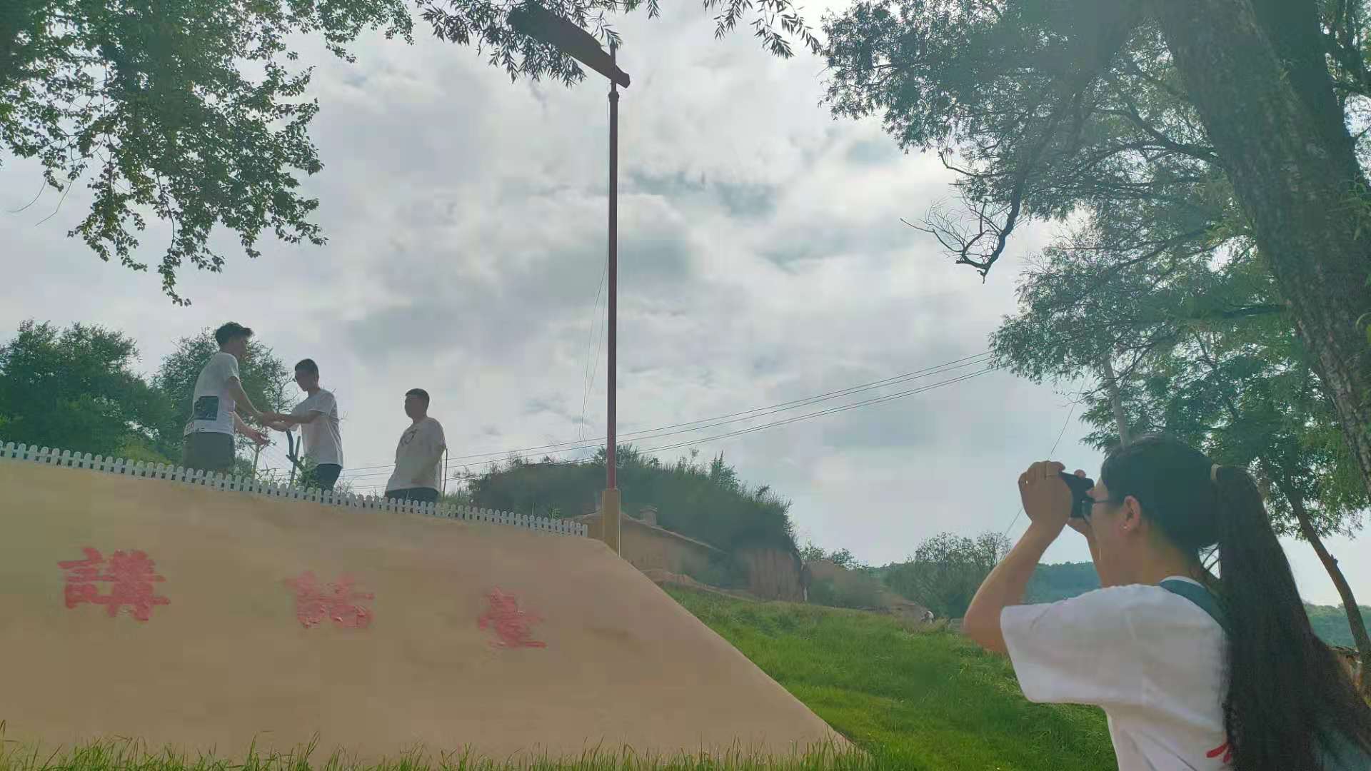 7月10日,實踐隊員們在甘泉開啟了第四站的實踐活動。邊走邊學、親身體驗、觀看影像等多形式的了解學習激發了隊員們的嘗試開展新的教育方式的熱情,大家坐在窯洞旁的樹墩上熱烈討論起可進行的教育方式。最終,實踐團隊成員共同決定采用更多元、更本土化、更具感染力的情景劇表現形式在舊址重現歷史。在講話堂,團隊成員重新再現了毛澤東“雪地講話”,扮演毛澤東的呂暢以激昂的語氣說出:“今后,我們要與陜北人民團結一起,共同完成中國革命的偉大任務。”結束了情景劇的表演,圓滿完成任務,得到在舊址附近居住村民的一致好評。活動結束后,主演呂暢表示:“這是我第一次演情景劇。通過情景劇講述紅色故事,可以在吸引人們注意力的同時,讓大家在“情”與“形”中重溫歷史、汲取紅色精神,讓黨史學習教育更有力度、更具溫度。”