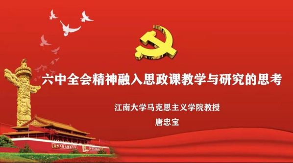 會(huì)議第一項(xiàng)內(nèi)容,邀請(qǐng)江南大學(xué)馬克思主義學(xué)院唐忠寶教授做題為《黨的十九屆六中全會(huì)精神融入思政課教學(xué)與研究的思考》的線上報(bào)告。唐教授以翔實(shí)新銳的網(wǎng)絡(luò)素材,從“堅(jiān)持黨的領(lǐng)導(dǎo),反對(duì)歷史虛無(wú)主義”、“堅(jiān)持人民至上,信仰共產(chǎn)主義”、“堅(jiān)持理論創(chuàng)新,推進(jìn)馬克思主義中國(guó)化”三個(gè)方面,對(duì)十九屆六中全會(huì)會(huì)議精神如何下沉并融入高校思政課課堂,做出了深入透徹的闡述和分析。唐老師的報(bào)告,學(xué)理性強(qiáng)、語(yǔ)言生動(dòng)、分析透徹,為今后推進(jìn)”三進(jìn)“工作提供了有效的方法和有益的啟示。