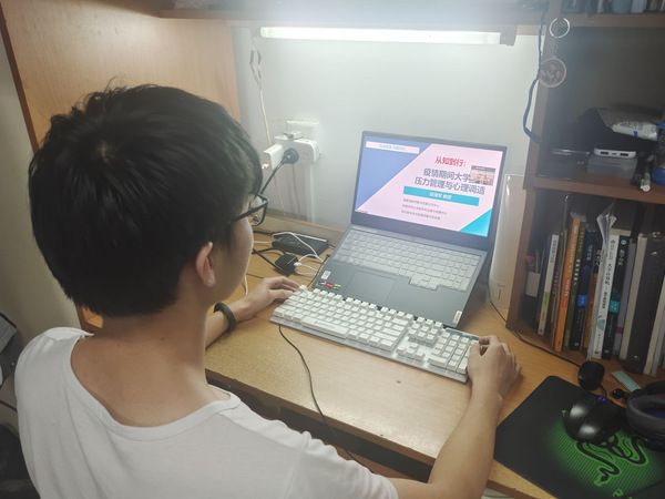 段海軍分別圍繞疫情期間大學生壓力管理與認知調適策略、大學生行為管理與情緒調節策略以及大學生自我認知與行動計劃三個方面展開。段海軍采用理論和實踐相結合的方式,從新冠肺炎應激反應、壓力管理與心理調適策略、自我認知以及個人行動計劃等方面分別向同學們闡述產生應激反應的來源、行為管理策略、情緒管理方法,提倡學生們要合理安排生活。在情緒管理方面,重點向學生介紹了情緒轉變ABCDE法,引導同學們掌握釋放壓力的方法,通過聆聽舒緩音樂等方式緩解壓力,學會認知調節,保持積極樂觀的心態。