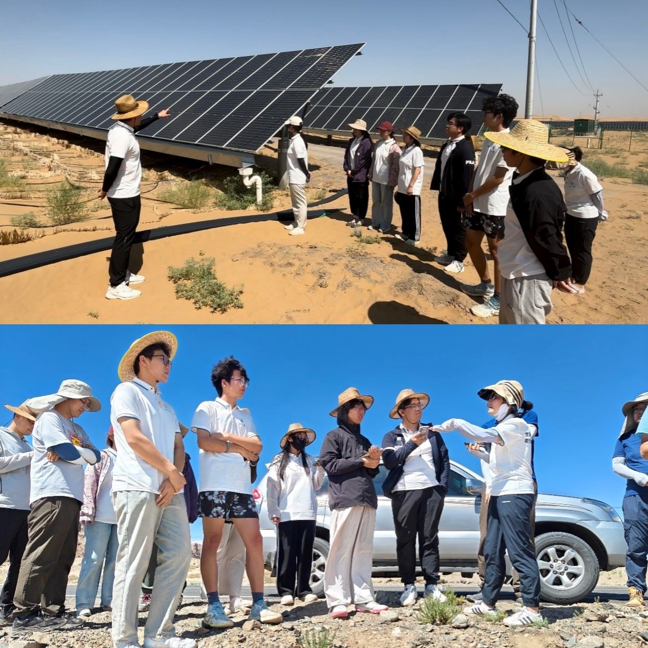 室外開課,明生態保護之要。實踐途中,指導教師李金洋就地以光伏治沙項目為例開展生動思政課,提出我國的防沙治沙、荒漠生態治理仍是亟待解決的難題,囑托實踐團隊成員要將個人投身于生態治理之中為生態治理貢獻力量;李婉歆老師就當地水文地質條件為實踐隊員們講解了我國西北旱區典型流域“山地--山間盆地—沖洪積扇—細土平原”的河流與地下水轉化模式,并說明黃河的補給使得幾字彎地區形成了獨特的地下水文過程與生態環境,進一步加深了隊員們對荒漠生態治理的理解。