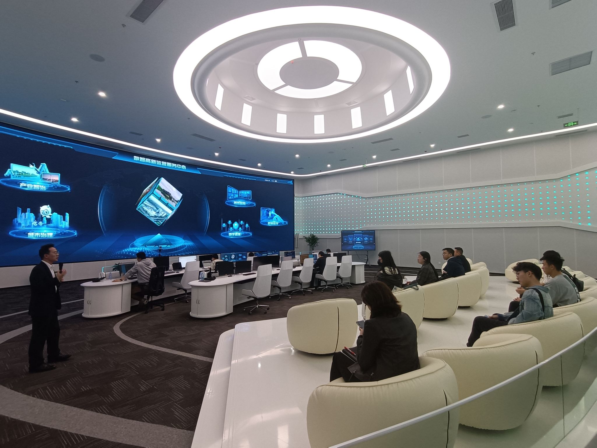 在陜西大秦元時代數(shù)字信息技術有限公司負責人的帶領下,同學們參觀了高新區(qū)的沉浸式展廳。展廳內部采用了裸眼3D等最新的沉浸式技術,使學生團隊仿佛置身于一個數(shù)字構建的世界中。通過高清大屏、地面投影以及環(huán)繞式音響系統(tǒng)等設備,展廳將高新區(qū)的發(fā)展成果、數(shù)字技術應用以及未來規(guī)劃等內容以生動、直觀的方式呈現(xiàn)出來。在這里,同學們近距離觀察數(shù)字技術的神奇魅力,感受數(shù)字經濟為城市治理、產業(yè)發(fā)展和經濟運行帶來的深刻變革。