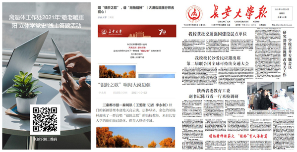 立體學(xué)知識(shí),宣傳顯成效。為引導(dǎo)老同志積極看待老齡社會(huì)和老年生活,結(jié)合黨史學(xué)習(xí)教育,10月11-14日,開展了“敬老暖重陽(yáng)立體學(xué)黨史”線上答題活動(dòng),將黨史知識(shí)、重陽(yáng)節(jié)知識(shí)、人口老齡化國(guó)情相關(guān)知識(shí)融入其中,500余名老同志參加答題活動(dòng)。同時(shí),廣泛宣傳離退休職工老有所樂、老有所為的風(fēng)采,其中我校“銀齡教師”的事跡材料《唱“銀齡之歌”,譜“胡楊精神”》、《“銀齡之歌”響徹大漠邊疆》被三秦都市報(bào)-秦聞、學(xué)校官方微信公眾號(hào)、校報(bào)收錄刊登。