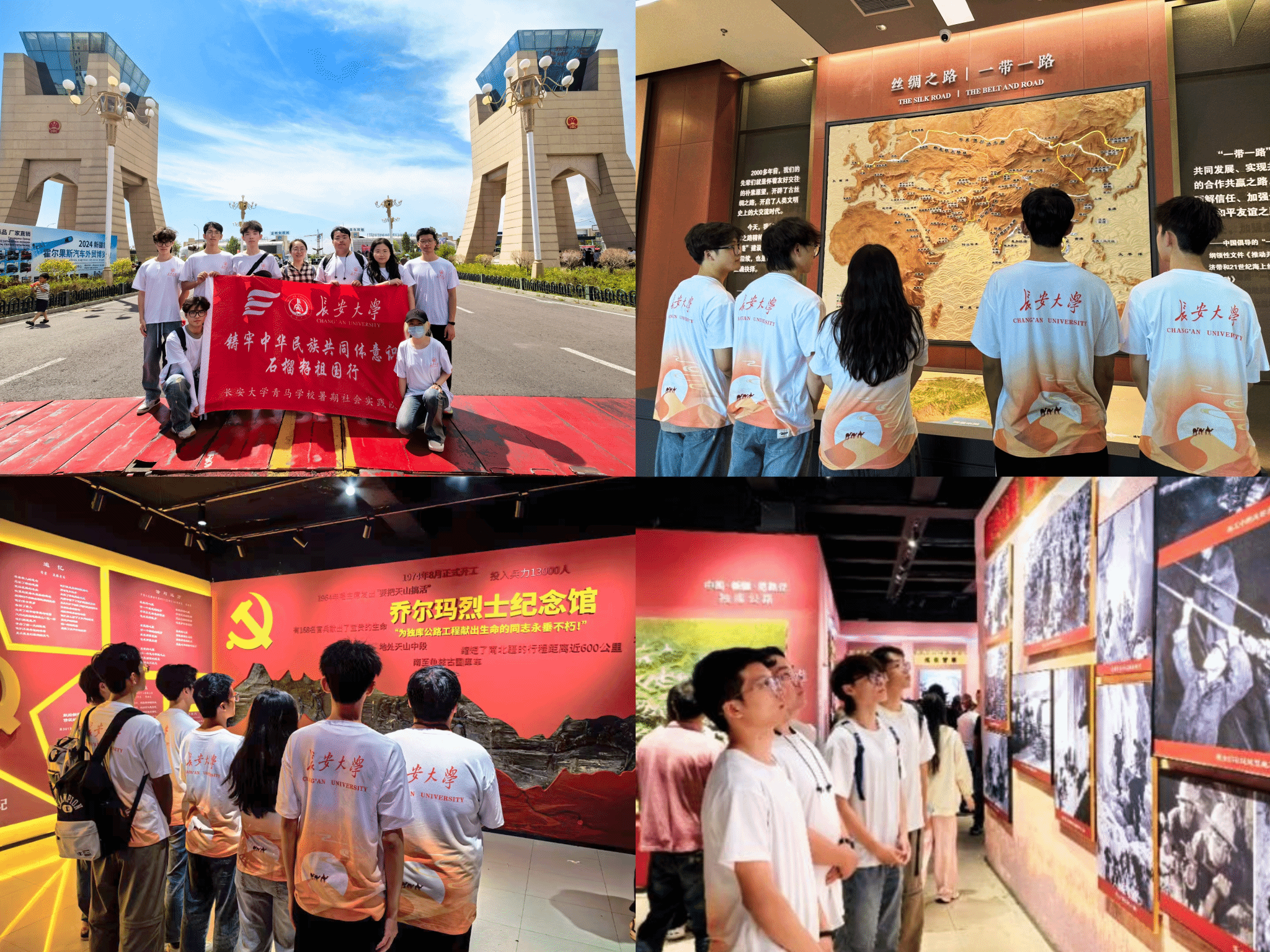 一帶一路促發(fā)展,兩路精神放光芒。實(shí)踐隊(duì)前往霍爾果斯國(guó)門(mén)文化展館、中哈經(jīng)濟(jì)合作區(qū)、獨(dú)庫(kù)公路博物館和喬爾瑪烈士陵園,學(xué)習(xí)領(lǐng)會(huì)“兩路”精神和不畏艱難、艱苦奮斗、勇于犧牲的天山筑路精神;加深對(duì)國(guó)門(mén)文化的認(rèn)識(shí),了解新疆對(duì)外開(kāi)放的發(fā)展歷程及新時(shí)代共建“一帶一路”取得的豐碩成果。