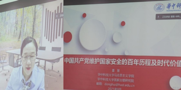 開幕式結束后,董慧教授以“中國共產黨維護國家安全的百年歷程及時代價值”為主題進行云端報告。董慧教授圍繞從安全到總體國家安全、中國共產黨維護國家安全的百年歷程、新時代中國特色總體國家安全、中國共產黨維護國家安全的時代價值四個部分展開論述。整個報告體系完整、內容豐富、思想深邃,真正做到了研究真問題,真研究問題。