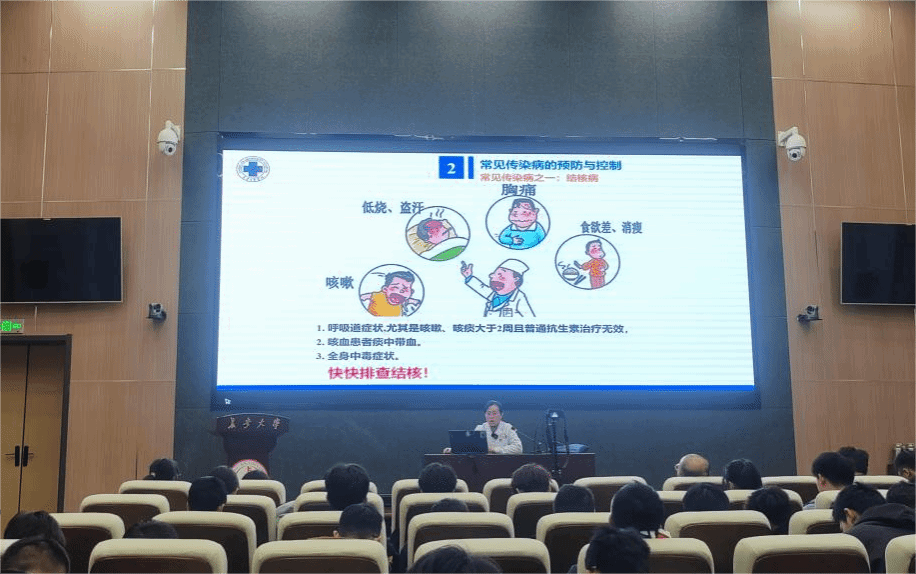 校醫院副主任醫師王波用通俗易懂的語言、圖文并茂的形式,就結核病、流感、諾如病毒、支原體、出血熱等春季常見傳染病的臨床表現和特征、傳染源、傳播途徑、易感人群等知識進行了詳細講解,并強調了預防傳染病的有效措施,建議學生及早接種疫苗、保持衛生習慣、加強體育鍛煉,特別是在有臨床表現時及時就醫,有效地阻斷傳染病的流行與傳播。講座現場還與學生積極互動,解答學生們在預防春季傳染病方面的問題與困惑,切實提高學生健康素養、防病意識和自我防護能力。