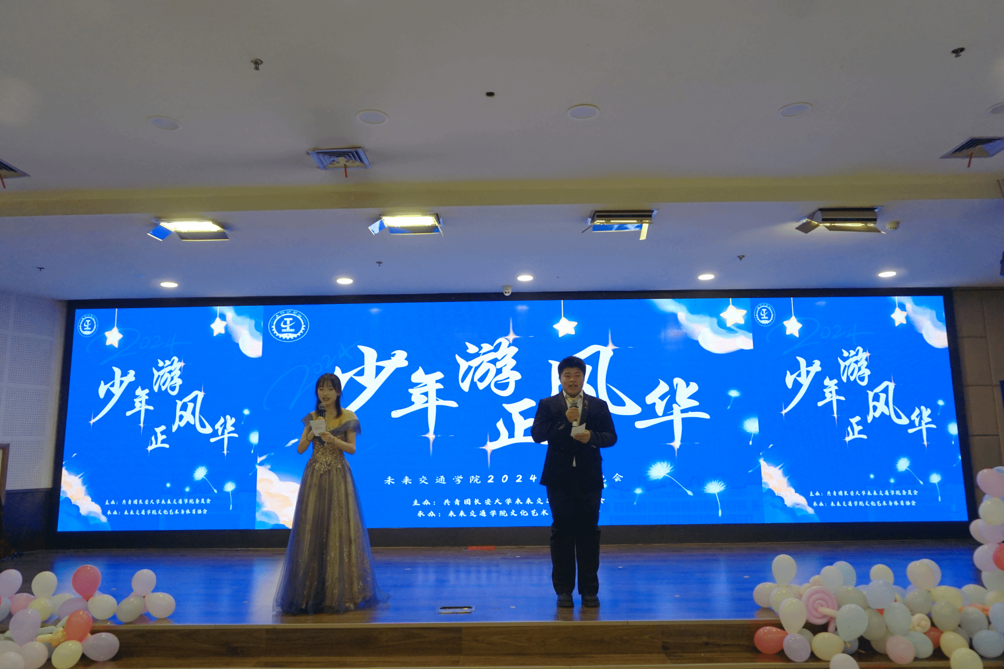 11月10日晚,未來交通學院在長安文化藝術中心三樓多功能報告廳隆重舉辦“少年游,正風華”2024級迎新聯(lián)歡晚會。新加坡工程院院士、學院院長Fwa Tien Fang,副院長湯穎穎、楊旭,系主任,新生班主任,教學與國際交流部、學生事務部成員與2024級全體本科生、研究生及其他年級學生代表共計230余人歡聚一堂,共襄盛舉,晚會由2021級本科生魏紫晗、2024級本科生陳洋共同主持。