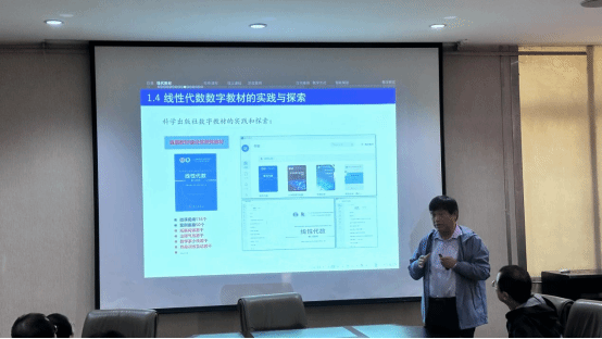 陳建龍教授介紹了東南大學線性代數課程的資源建設,包括新形態教材、先修課、MOOC、思政案例和應用案例;其次分享線上線下混合式教學的做法和人工智能輔助教學的一點探索;最后展示課程建設的成效和示范輻射作用。報告結束后,與會教師圍繞報告內容展開了深入的探討與交流。整場報告深入淺出,內容豐富有深度。