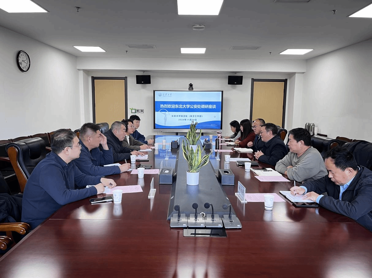 司會對我校的歡迎表示感謝,并介紹了東北大學穩(wěn)定安全工作的基本情況和特色做法。會上,雙方圍繞“三防”建設、反詐教育、校園交通管理、門禁管理、校衛(wèi)隊員用工等工作進行了深入交流和探討。