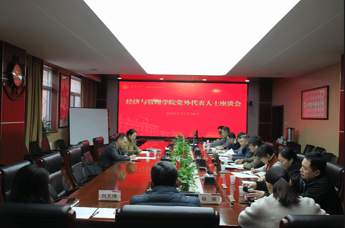 為更好發(fā)揮黨外人士在學(xué)院改革發(fā)展中的作用,提升學(xué)院民主黨派參政議政建言獻策的能力,11月28日下午,經(jīng)濟與管理學(xué)院在學(xué)院一樓會議室召開黨外人士座談會,統(tǒng)戰(zhàn)部部長石松、統(tǒng)戰(zhàn)部副研究員劉小莉,學(xué)院黨政領(lǐng)導(dǎo)、全體黨外人士參加座談會,會議由學(xué)院黨委副書記、副院長、紀委書記龔少博主持。