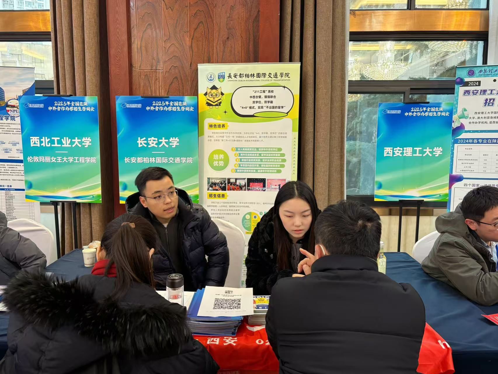 為進一步擴大學院影響力,穩步推進2025年招生工作,12月22日,長安都柏林國際交通學院張力雄、陳鹿姿參加了由陜西高考服務網主辦的2025年全國在陜招生中外合作辦學專場咨詢會。此次活動匯聚了西安交通大學、西北工業大學、同濟大學等近三十所知名院校的中外合作辦學機構(項目),吸引了陜西省各高中的300余名家長和考生參與。