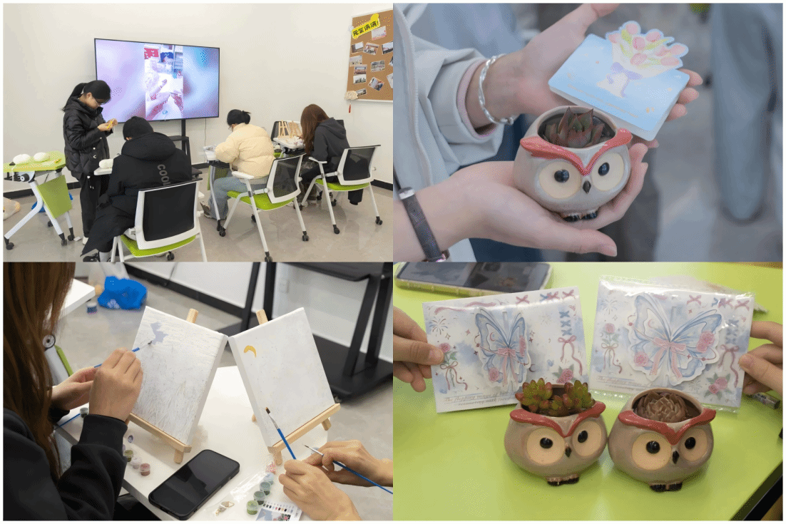 本次活動旨在通過豐富多彩的手工DIY活動,幫助女性師生釋放壓力,提升幸福感。活動伊始,心理中心教師程鈴琳給大家帶來了一場題為“關愛自我,從心開始”的微講座。程鈴琳從女性常見的心理困擾入手,結合生動案例,深入淺出地講解了壓力管理、情緒調節等方面的心理知識,并分享了實用的減壓技巧,引導大家關注自身心理健康,學會愛自己、呵護自己。隨后,程鈴琳帶領大家體驗沉浸式動手實踐帶來的心靈減壓效果,大家通過手繪、手作的方式,用畫筆勾勒出一件件精美的作品,用色彩表達著內心的情感與對生活的熱愛,并在卡片上寫下內心深處對自己、對親友的祝福,共同將綠植種進春天的泥土里,傳遞著對美好未來的期許。