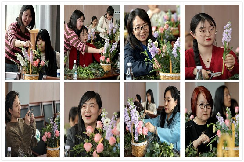 在自由創作環節,女教職工們化身“花藝師”,將玫瑰、紫羅蘭、尤加利葉等花材化作創作元素,專注打造形式多樣、錯落有致的專屬花籃。經過一小時的精心創作,四十余件花藝作品或清新淡雅、或熱烈奔放,宛如一場微型花卉博覽會。