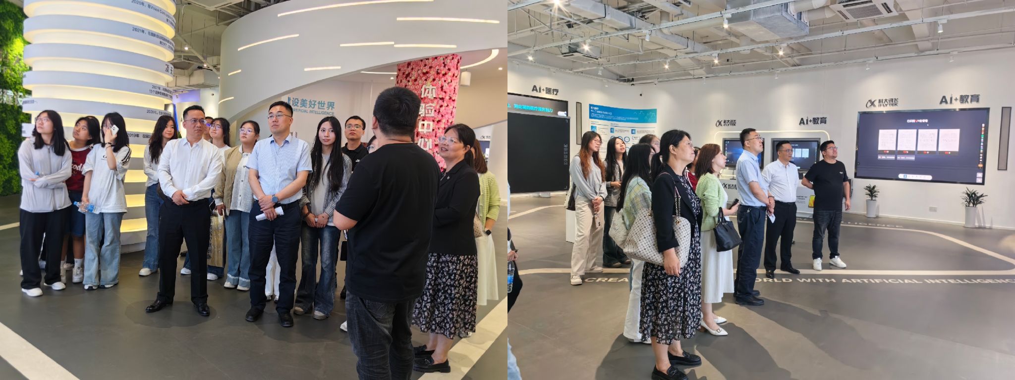 在科大訊飛AI資源部渠道總監成程的熱情接待下,學院一行參觀了人工智能展廳,沉浸式體驗了科大訊飛在智能語音、自然語言處理、智慧教育等領域的創新成果。通過實時語音轉寫、多語種翻譯系統演示,團隊直觀感受到AI技術對外語教學、跨文化傳播及語言服務行業的變革潛力。馮正斌指出,人工智能正重構外語學科發展邊界,培養“外語+科技”的復合型人才是時代賦予我們的新命題。